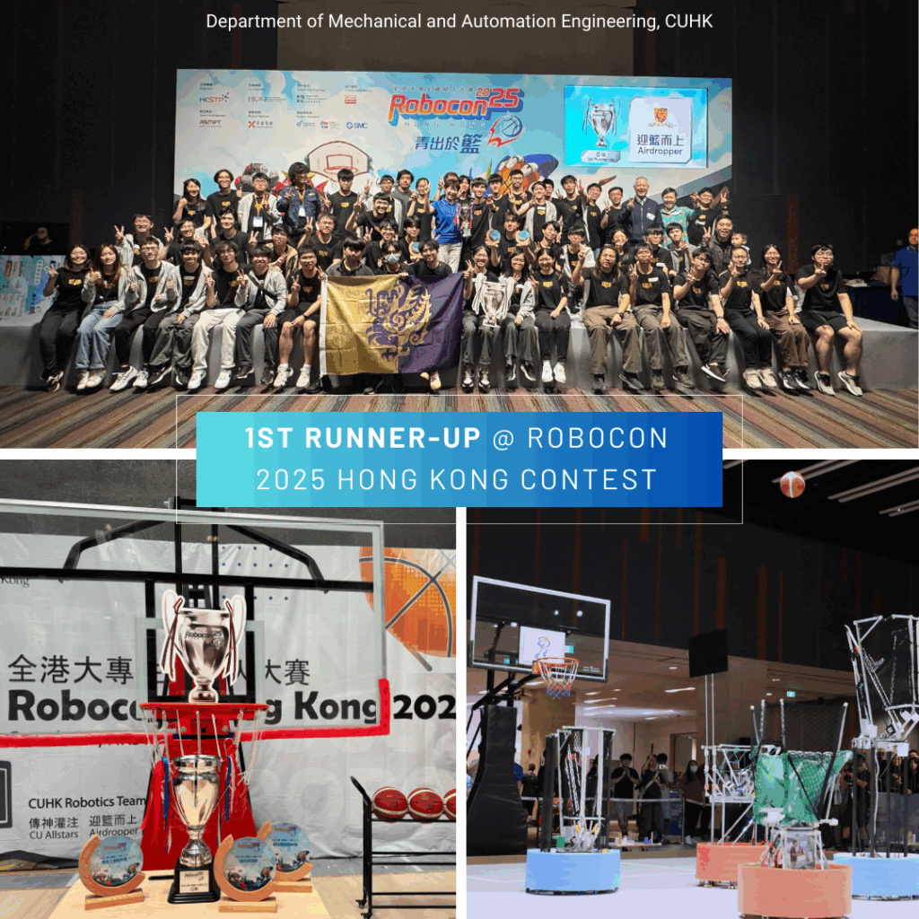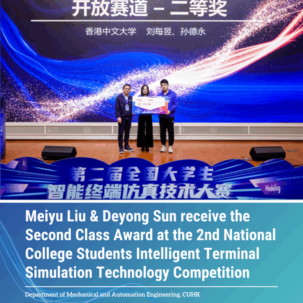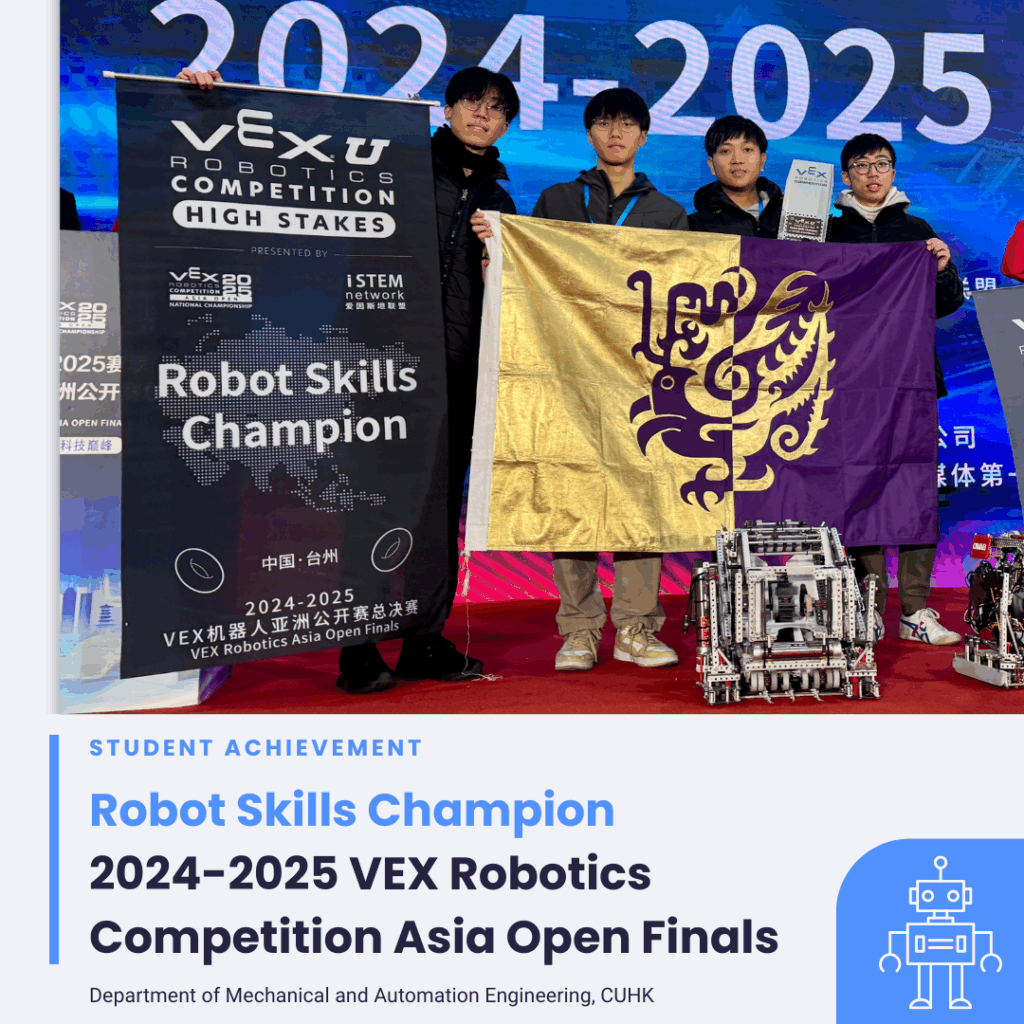 NEWS & AWARDS HOME DEPARTMENT AWARDS News Awards First-class Award in the National Finals of the 2025 China University Students Engineering Practice and Innovation Ability Competition September 4, 2025 Best Application Paper Award at the 7th International Conference on Cable-Driven Parallel Robots August 28, 2025 Best Poster Award at the International Association for the Study of Affective Touch 2025 August 25, 2025 Three projects led by MAE professors awarded funding in the second round of the ITC’s RAISe+ Scheme August 11, 2025 First Runner-up at the Robocon 2025 Hong Kong Contest June 23, 2025 IMechE Hong Kong Branch Best Student Design Award 2024/25 June 16, 2025 Robot Skills Champion at the 2024-2025 VEX Robotics Competition Asia Open Finals June 10, 2025 First Runner-up in the ASME Hong Kong Section X PolyU Student Design Competition 2025 June 3, 2025 VTech Innovation and Sustainability Award 2023/24 January 10, 2025 Second Class Award at the 2nd National College Students Intelligent Terminal Simulation Technology Competition December 9, 2024 Dr. Jialin Jiang wins the Best Paper Award at the CSIS-IAC 2024 December 6, 2024 Page1 Page2 Page3 … Page11 2025 2024 2023 2022 2021 2020 2019 2018