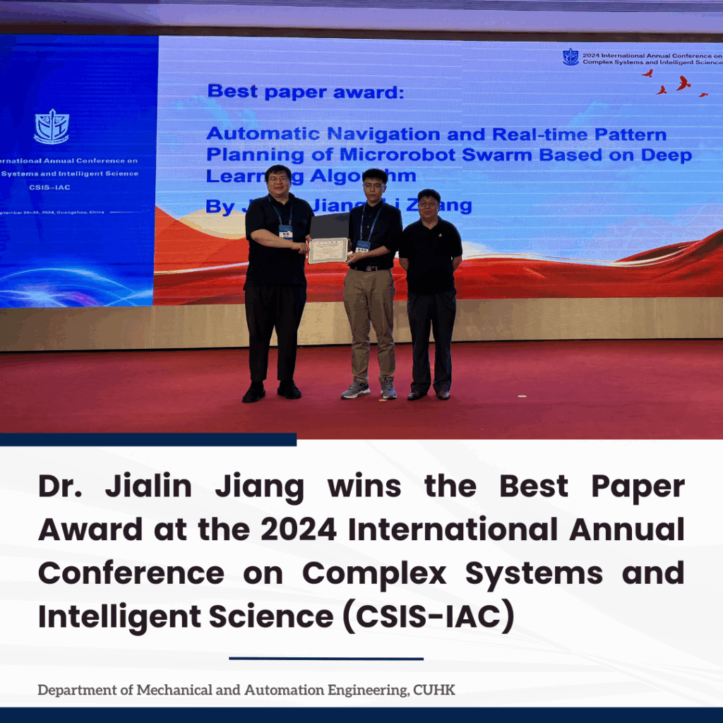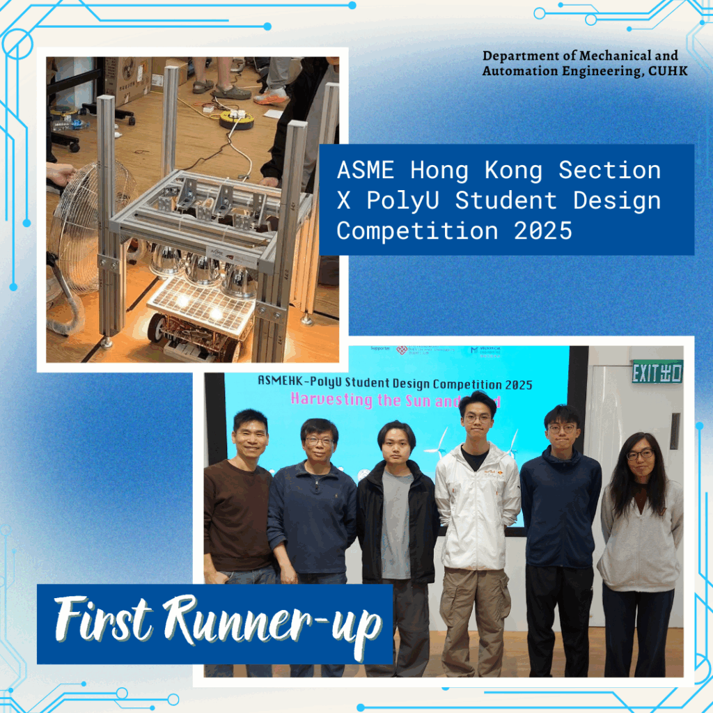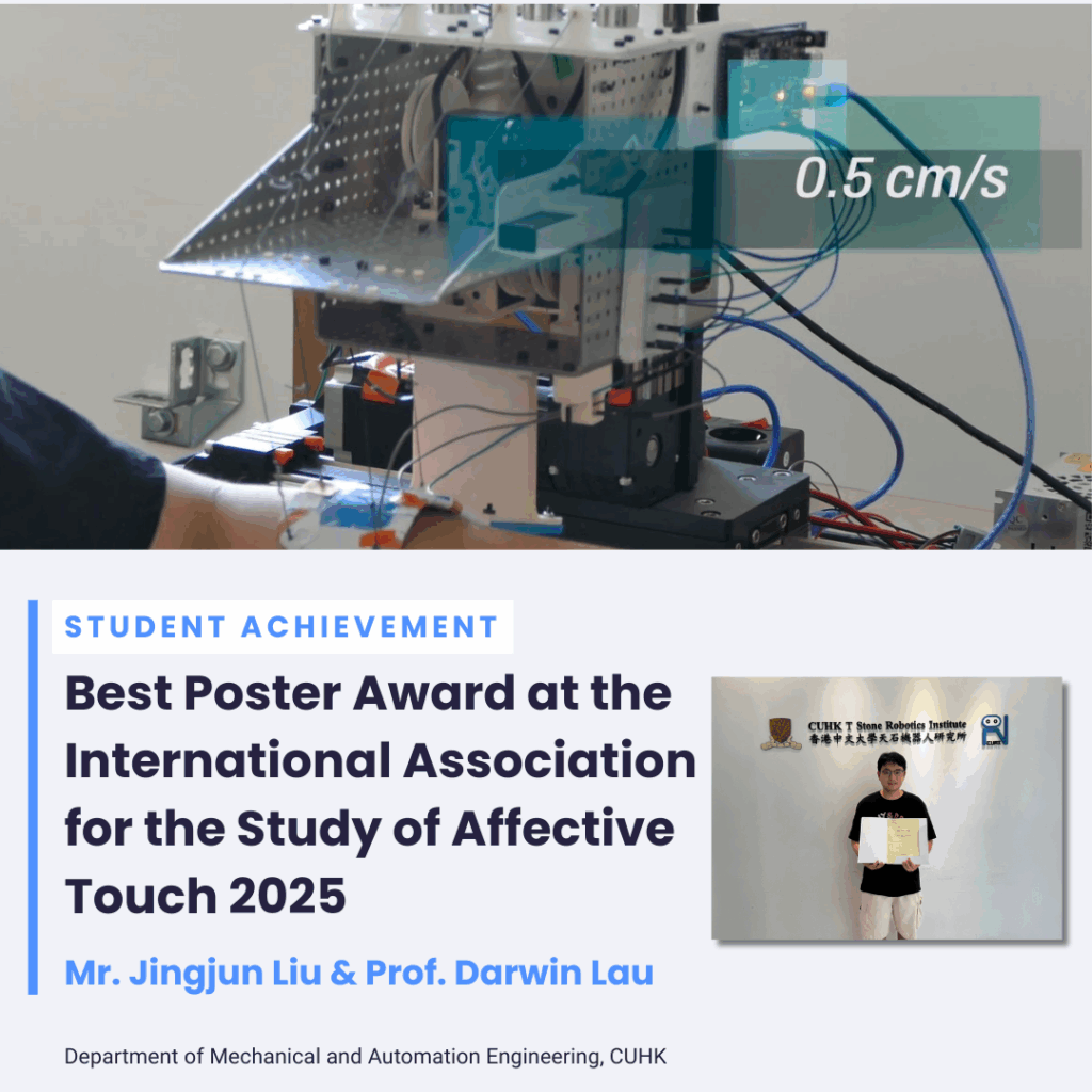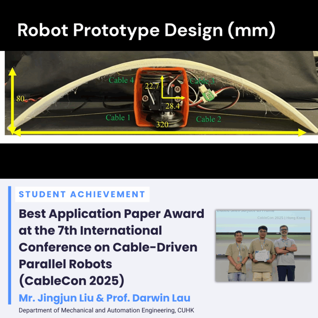 NEWS & AWARDS HOME DEPARTMENT AWARDS News Awards First-class Award in the National Finals of the 2025 China University Students Engineering Practice and Innovation Ability Competition September 4, 2025 Best Application Paper Award at the 7th International Conference on Cable-Driven Parallel Robots August 28, 2025 Best Poster Award at the International Association for the Study of Affective Touch 2025 August 25, 2025 Three projects led by MAE professors awarded funding in the second round of the ITC’s RAISe+ Scheme August 11, 2025 First Runner-up at the Robocon 2025 Hong Kong Contest June 23, 2025 IMechE Hong Kong Branch Best Student Design Award 2024/25 June 16, 2025 Robot Skills Champion at the 2024-2025 VEX Robotics Competition Asia Open Finals June 10, 2025 First Runner-up in the ASME Hong Kong Section X PolyU Student Design Competition 2025 June 3, 2025 VTech Innovation and Sustainability Award 2023/24 January 10, 2025 Second Class Award at the 2nd National College Students Intelligent Terminal Simulation Technology Competition December 9, 2024 Dr. Jialin Jiang wins the Best Paper Award at the CSIS-IAC 2024 December 6, 2024 Page1 Page2 Page3 … Page11 2025 2024 2023 2022 2021 2020 2019 2018