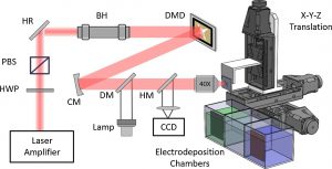 Configuration of the high-resolution 3-D metal printing system. HWP: half wave plate; PBS: polarized beam splitter; HR: high reflectance mirror; BH: beam homogenizer; DMD: digital micro-mirror device; CM: concave mirror; DM: dichroic mirror; HM: half mirror; CCD: charge coupled device.