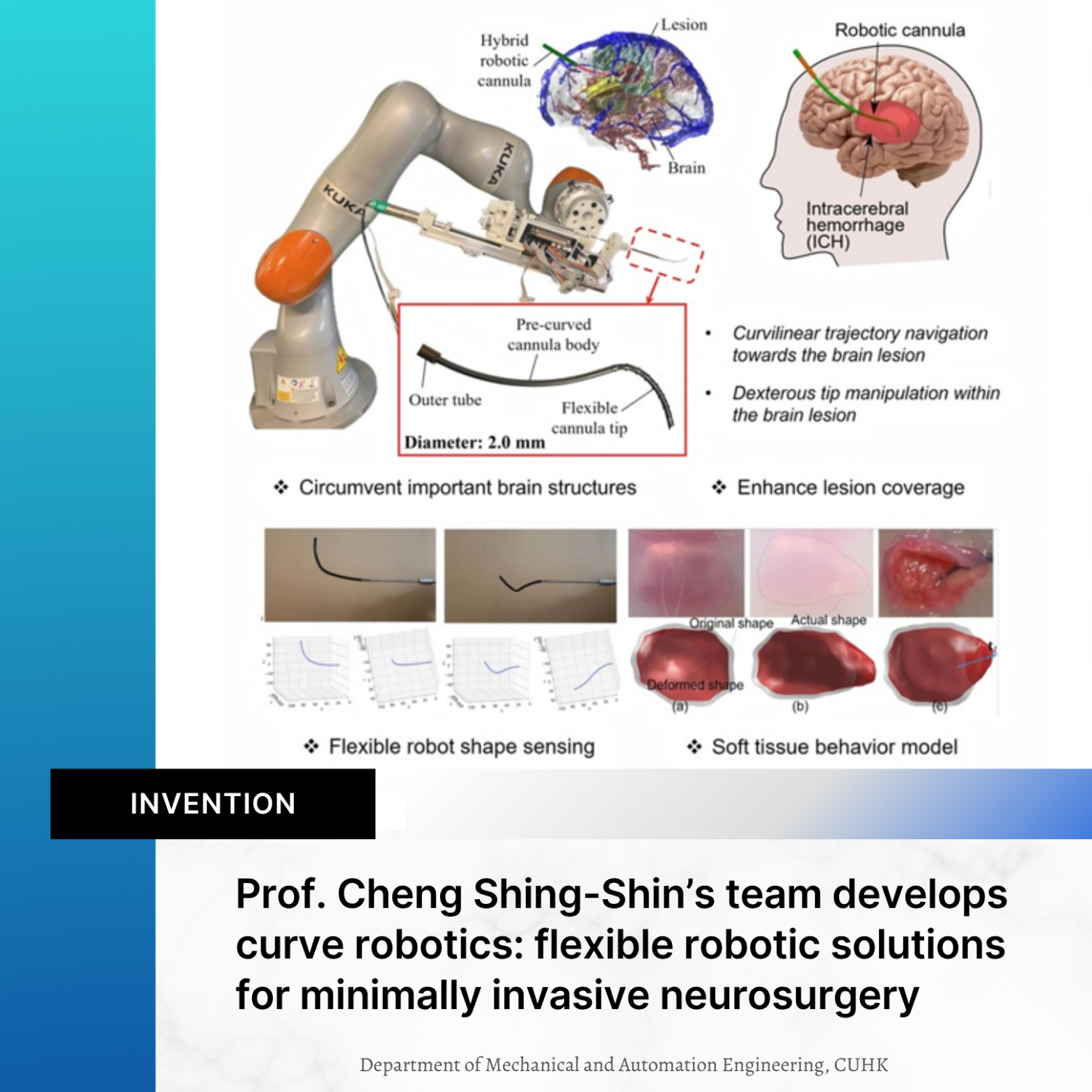 The research team of Professor Cheng Shing-Shin has developed curve robotics: flexible robotic solutions for minimally invasive neurosurgery. The invention has recently received international recognition at the 50th International Exhibition of Inventions Geneva, winning a Gold Medal.