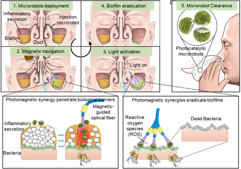 Under an external magnetic field, the microrobots swarm and navigate rapidly to infection sites. Visible light delivered via optical fibre activates antibacterial activity, enabling photothermal effects that reduce mucus viscosity and enhance penetration and generation of reactive oxygen species (ROS) for powerful biofilm disruption.